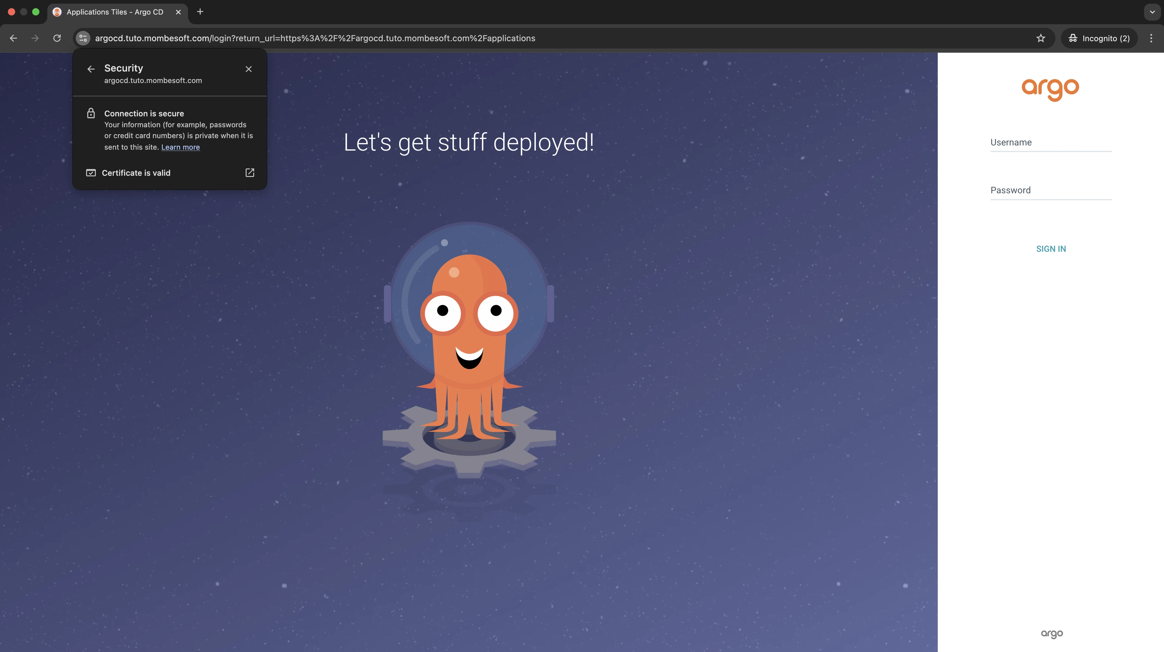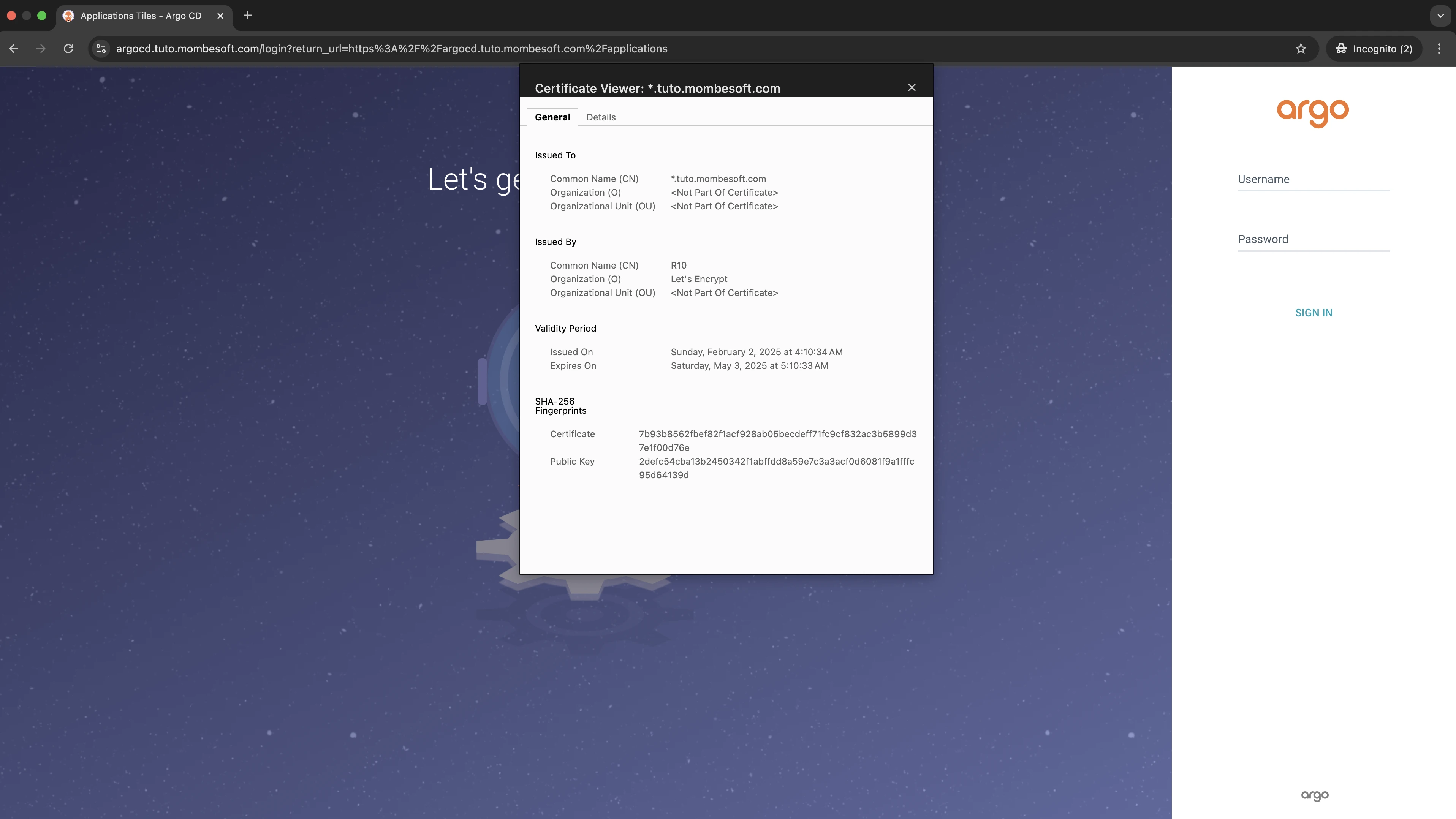 local DNS -> DNS Records:- Maintenant si vous accédez à la https://argocd.tuto.domain.com vous allez être redirigé sur une page https sécurisé :