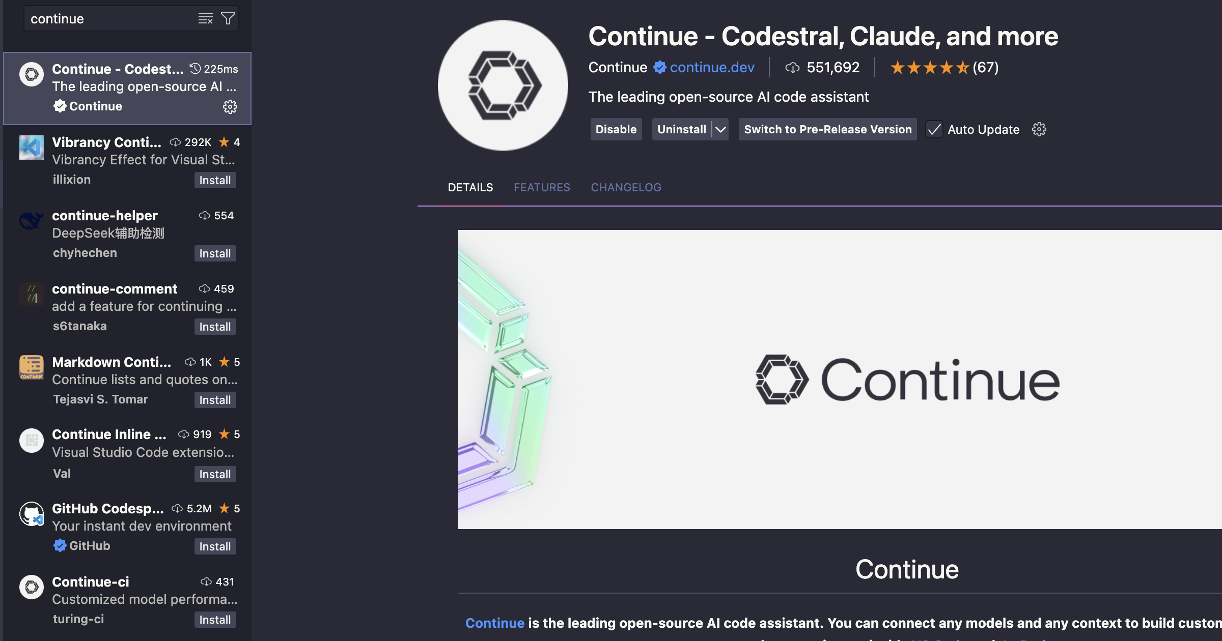 vscode: ouvrez l’appliction -> puisExtensions-> rechercherContinue->InstallIntellij:
