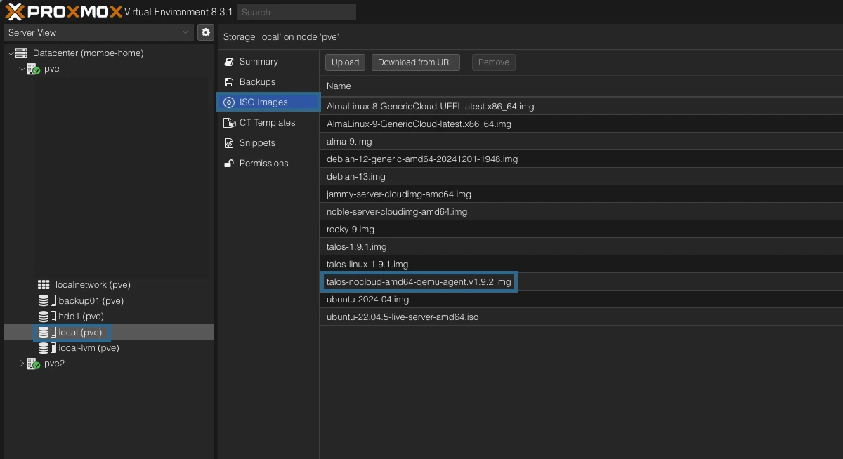 wget https://factory.talos.dev/image/ce4c980550dd2ab1b17bbf2b08801c7eb59418eafe8f279833297925d67c7515/v1.9.2/nocloud-amd64.raw.xz xz -d nocloud-amd64.raw.xz mv nocloud-amd64.raw /var/lib/vz/template/iso/talos.1.9.2.img #proxmox ne supporte pas directement les fichiers raw mais on peut le renommer en .img